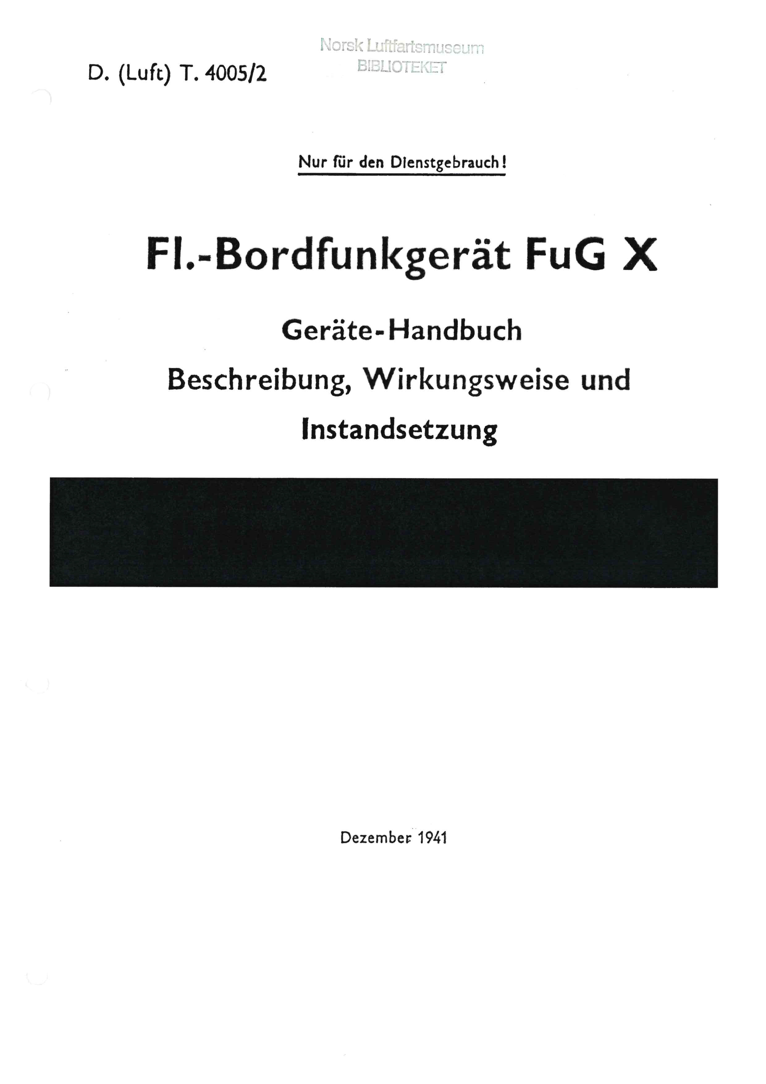 | Tittel: | D. (Luft) T. 4005/2 - Fl.-Bordfunkgerät FuG X : Geräte-Handbuch - Beschreibung, Wirkungsweise und Instandsetzung (Nur für den Dienstgebrauch!) |  | Ansvar: | Der Reichsminister der Luftfahrt und Oberbefehlshaber der Luftwaffe |  | Forfatter: | Luftwaffe |  | Materialtype: | Manual/Sivil |  | Signatur: | 20-A-2 |  | Utgitt: | Berlin : Luftwaffe, 1941 |  | Omfang: | 289 s. - ill. |  | Serie: | D. (Luft) T. ; 4005/2  |  | Emneord: | 4005/2 / Beschreibung / Bordfunkgerät / D. (Luft) T. 4005/2 / FuG X / Geräte-Handbuch |  | Lokal Note (gave): | Stein Ivar Moe |  | Materialbetegnelse: | Technical Handbook |  | Materialbetegnelse: | Perm |  | Note: | Håndboken ligger også som nedlastbar PDF på høyre side.