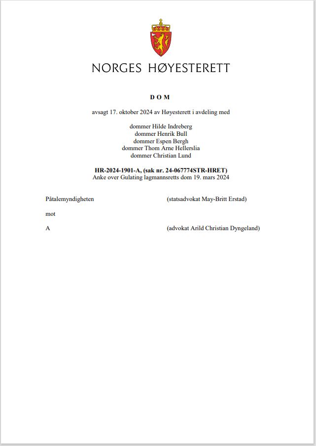 Tittel: | Skjerpet straff for overgrep mot to døtre - HR-2024-1901-A, (sak nr. 24-067774STR-HRET) : 17. oktober 2024 avsa Høyesterett dom | Ansvar: | Påtalemyndigheten (statsadvokat May-Britt Erstad) mot A (advokat Arild Christian Dyngeland)En mann var domfelt for en rekke overgrep mot sine to døtre, begått over en lang periode. Lagmannsretten hadde fastsatt straffen til fengsel i 8 år og 6 måneder. Påtalem | Materialtype: | Dom | Signatur: | Høyesterett | Utgitt: | Oslo : Høyesterett, 2024 | Omfang: | 9 sider | Emneord: | Barn / Høyesterettsdom / Overgrep / Seksuelle overgrep / Strafferett / Straffeutmåling | Stikkord: | HR-2024-1901-A / Straffeloven (2005) § 301 / Straffeloven (2005) § 79 a | Note: | Straffesak, anke over Gulating lagmannsretts dom. | Innhold: | En mann var domfelt for en rekke overgrep mot sine to døtre, begått over en lang periode. Lagmannsretten hadde fastsatt straffen til fengsel i 8 år og 6 måneder. Påtalemyndigheten anket straffutmålingen til Høyesterett. Saken reiste særlig spørsmål om hvordan den samlede straffen skal fastsettes ved overgrep mot to fornærmede.