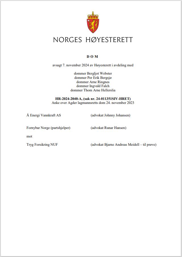 Tittel: | Skade på kraftverk var ikke dekket av forsikringen - HR-2024-2040-A, (sak nr. 24-011351SIV-HRET) : 7. november 2024 avsa Høyesterett dom | Ansvar: | Å Energi Vannkraft AS (advokat Johnny Johansen), Fornybar Norge (partshjelper) (advokat Runar Hansen) mot Tryg Forsikring NUF (advokat Bjarne Andreas Meidell) | Materialtype: | Dom | Signatur: | Høyesterett | Utgitt: | Oslo : Høyesterett, 2024 | Omfang: | 11 sider | Emneord: | Forsikringsrett / Høyesterettsdom / Kraftverk | Stikkord: | HR-2024-2040-A | Note: | Sivil sak, anke over Agder lagmannsretts dom 24. november 2023. | Innhold: | Rygene kraftverk i Grimstad er eid av Å Energi Vannkraft AS. I desember 2019 brøt løpehjulskammeret sammen. Kostnadene til utskiftning av turbinen med løpehjulskammeret, samt avbruddstapet, beløp seg til om lag 77 millioner kroner. Kraftverket hadde en energiforsikring som dekker «plutselig og uforutsett fysisk skade som oppstår i forsikringstiden». Tryg Forsikring mente at skaden ikke kunne ansees som «plutselig» og avslo kravet om forsikringsdekning