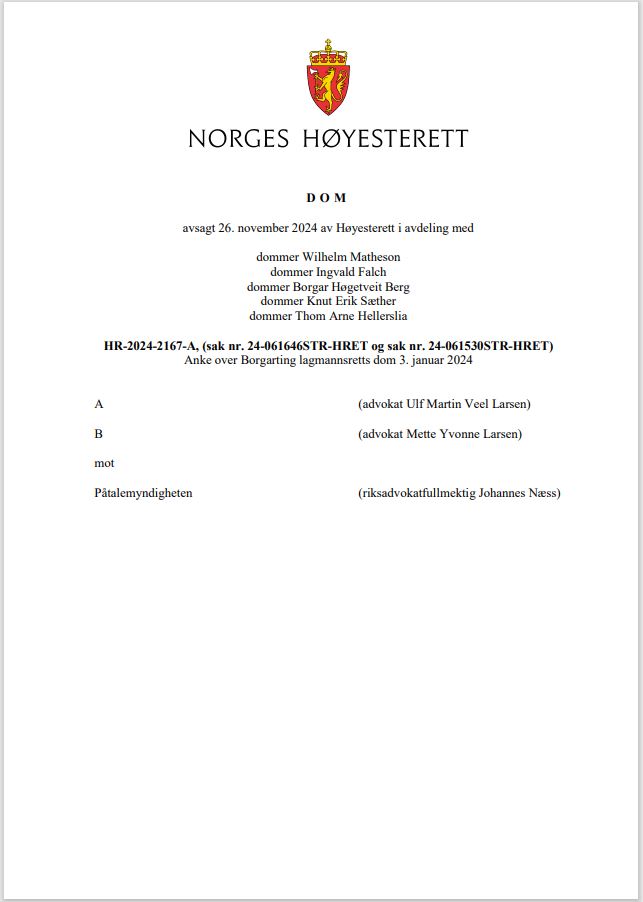Tittel: | Extinction Rebellion-demonstranter frifinnes - HR-2024-2167-A, (sak nr. 24-061646STR-HRET og sak nr. 24-061530STR-HRET) : 26. november 2024 avsa Høyesterett dom | Ansvar: | A (advokat Ulf Martin Veel Larsen), B (advokat Mette Yvonne Larsen) mot Påtalemyndigheten (riksadvokatfullmektig Johannes Næss) | Materialtype: | Dom | Signatur: | Høyesterett | Utgitt: | Oslo : Høyesterett, 2024 | Omfang: | 10 sider | Emneord: | Høyesterettsdom / Straffeprosess / Strafferett | Stikkord: | EMK - Artikkel 11 - Konvensjon om beskyttelse av menneskerettighetene og de grunnleggende friheter / Grunnloven § 101 / HR-2024-2167-A / Politiloven (1995) § 10 / Politiloven (1995) § 5 / Politiloven (1995) § 7 / Straffeloven (2005) § 61 / Straffeprosessloven (1981) § 173 | Note: | Straffesak, anke over Borgarting lagmannsretts dom 3. januar 2024. | Innhold: | To demonstranter hadde deltatt i sitt ned-aksjoner i Olje- og energidepartementets resepsjon. Etter noen timer påla politiet dem å fjerne seg, noe de ikke gjorde. Demonstrantene ble da pågrepet og kjørt til sentralarresten, hvor de satt noen timer før de ble løslatt. Politiet ga demonstrantene forelegg – bøtestraff – som de ikke godtok.