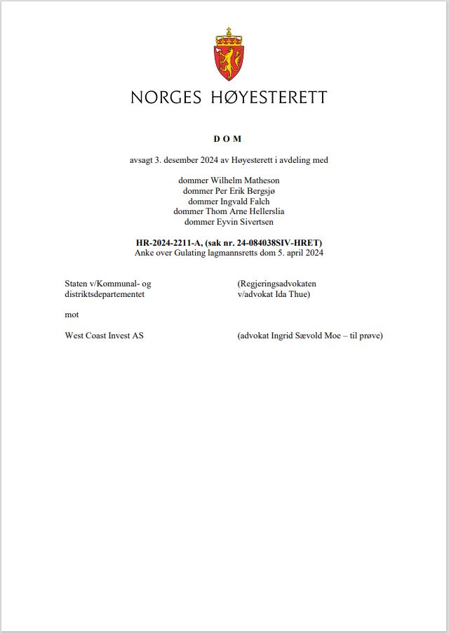 Tittel: | Brygge fra 1970-tallet var ikke ulovlig oppført - HR-2024-2211-A, (sak nr. 24-084038SIV-HRET) : 3. desember 2024 avsa Høyesterett dom | Ansvar: | Staten v/Kommunal- og distriktsdepartementet (Regjeringsadvokatenv/advokat Ida Thue) mot West Coast Invest AS (advokat Ingrid Sævold Moe) | Materialtype: | Dom | Signatur: | Høyesterett | Utgitt: | Oslo : Høyesterett, 2024 | Omfang: | 14 sider | Emneord: | Forvaltningsrett / Høyesterettsdom / Plan- og bygningsrett / Strandsonen | Stikkord: | Bygningsloven (1965) § 84 / HR-2024-2211-A | Note: | Sivil sak, anke over Gulating lagmannsretts dom 5. april 2024. | Innhold: | På 1970-tallet ble det oppført en 76 kvadratmeter stor brygge på en strandeiendom i Bergen kommune. Kommunen foretok på 2010-tallet en kartlegging av tiltak i strandsonen. Da det ikke forelå byggemelding om oppføring av brygga, ga kommunen pålegg om riving. Dagens eier av eiendommen mente på sin side at brygga ikke var meldepliktig etter dagjeldende bygningslov.