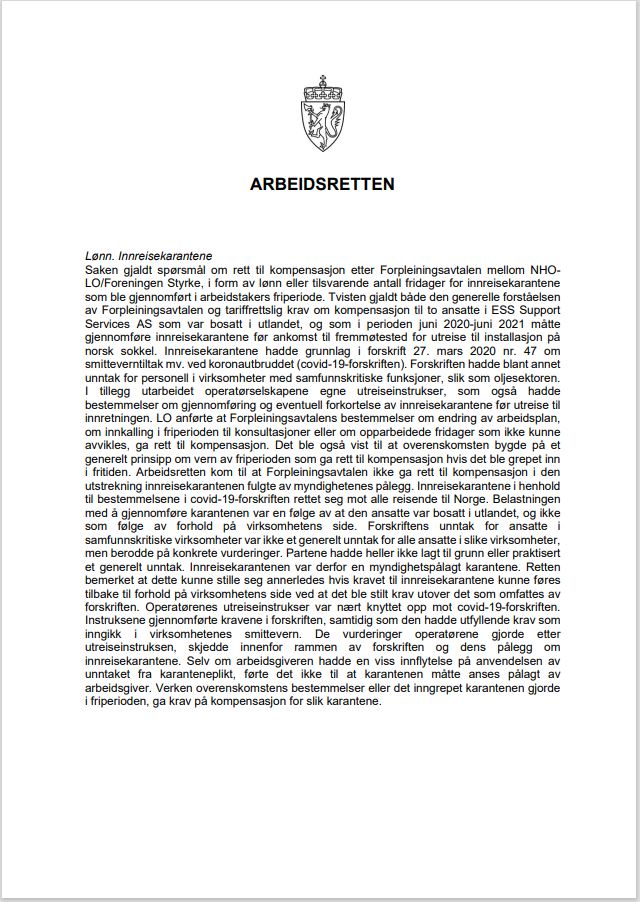 Innhold: | Dommens innledning: Saken gjaldt spørsmål om rett til kompensasjon etter Forpleiningsavtalen mellom NHO-LO/Foreningen Styrke, i form av lønn eller tilsvarende antall fridager for innreisekarantene som ble gjennomført i arbeidstakers friperiode. Tvisten gjaldt både den generelle forståelsen av Forpleiningsavtalen og tariffrettslig krav om kompensasjon til to ansatte i ESS Support Services AS som var bosatt i utlandet, og som i perioden juni 2020-juni 2021 måtte gjennomføre innreisekarantene før ankomst til fremmøtested for utreise til installasjon på norsk sokkel. Innreisekarantene hadde grunnlag i forskrift 27. mars 2020 nr. 47 om smitteverntiltak mv. ved koronautbruddet (covid-19-forskriften). Forskriften hadde blant annet unntak for personell i virksomheter med samfunnskritiske funksjoner, slik som oljesektoren. I tillegg utarbeidet operatørselskapene egne utreiseinstrukser, som også hadde bestemmelser om gjennomføring og eventuell forkortelse av innreisekarantene før utreise til innretningen. LO anførte at Forpleiningsavtalens bestemmelser om endring av arbeidsplan, om innkalling i friperioden til konsultasjoner eller om opparbeidede fridager som ikke kunne avvikles, ga rett til kompensasjon. Det ble også vist til at overenskomsten bygde på et generelt prinsipp om vern av friperioden som ga rett til kompensasjon hvis det ble grepet inn i fritiden. Arbeidsretten kom til at Forpleiningsavtalen ikke ga rett til kompensasjon i den utstrekning innreisekarantenen fulgte av myndighetenes pålegg. Innreisekarantene i henhold til bestemmelsene i covid-19-forskriften rettet seg mot alle reisende til Norge. Belastningen med å gjennomføre karantenen var en følge av at den ansatte var bosatt i utlandet, og ikke som følge av forhold på virksomhetens side. Forskriftens unntak for ansatte i samfunnskritiske virksomheter var ikke et generelt unntak for alle ansatte i slike virksomheter, men berodde på konkrete vurderinger. Partene hadde heller ikke lagt til grunn eller praktisert et generelt unntak. Innreisekarantenen var derfor en myndighetspålagt karantene. Retten bemerket at dette kunne stille seg annerledes hvis kravet til innreisekarantene kunne føres tilbake til forhold på virksomhetens side ved at det ble stilt krav utover det som omfattes av forskriften. Operatørenes utreiseinstrukser var nært knyttet opp mot covid-19-forskriften. Instruksene gjennomførte kravene i forskriften, samtidig som den hadde utfyllende krav som inngikk i virksomhetenes smittevern. De vurderinger operatørene gjorde etter utreiseinstruksen, skjedde innenfor rammen av forskriften og dens pålegg om innreisekarantene. Selv om arbeidsgiveren hadde en viss innflytelse på anvendelsen av unntaket fra karanteneplikt, førte det ikke til at karantenen måtte anses pålagt av arbeidsgiver. Verken overenskomstens bestemmelser eller det inngrepet karantenen gjorde i friperioden, ga krav på kompensasjon for slik karantene.