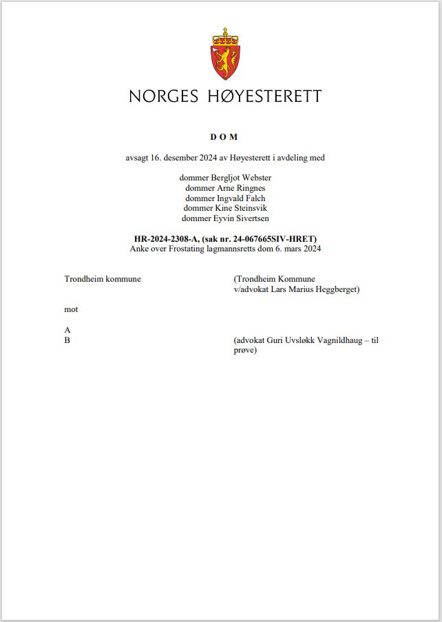 Tittel: | Refusjonsvedtak etter plan- og bygningsloven kjent ugyldig - HR-2024-2308-A, (sak nr. 24-067665SIV-HRET) : 6. desember 2024 avsa Høyesterett dom | Ansvar: | Trondheim kommune (Trondheim Kommune v/advokat Lars Marius Heggberget) mot A, B (advokat Guri Uvsløkk Vagnildhaug) | Materialtype: | Dom | Signatur: | Høyesterett | Utgitt: | Oslo : Høyesterett, 2024 | Omfang: | 10 sider | Emneord: | Forvaltningsrett / Høyesterettsdom / Plan- og bygningsrett | Stikkord: | Grunnloven § 89 / HR-2024-2308-A / Plan- og bygningsloven (2008) § 18-8 / Plan- og bygningsloven (2008) § 18-9 | Note: | Sivil sak, anke over Frostating lagmannsretts dom 6. mars 2024. | Innhold: | Saken gjelder gyldigheten av vedtak om refusjon av kostnader til bygging av vei, vann og avløp i Trondheim.