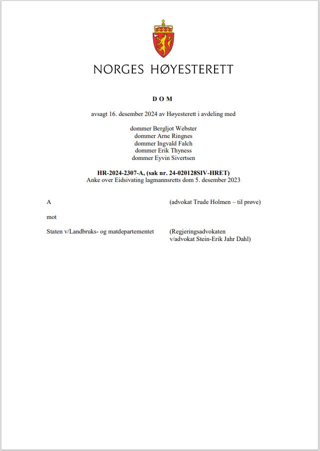 Tittel: | Gårdbruker fikk ikke erstatning fra statens naturskadeordning - HR-2024-2307-A, (sak nr. 24-020128SIV-HRET) : 16. desember 2024 avsa Høyesterett dom | Ansvar: | A (advokat Trude Holmen) mot Staten v/Landbruks- og matdepartementet (Regjeringsadvokaten v/advokat Stein-Erik Jahr Dahl) | Materialtype: | Dom | Signatur: | Høyesterett | Utgitt: | Oslo : Høyesterett, 2024 | Omfang: | 11 sider | Emneord: | Erstatningsrett / Høyesterettsdom / Naturskade | Stikkord: | HR-2024-2307-A / Naturskadeerstatningslova (2014) § 2 | Note: | Sivil sak, anke over Eidsivating lagmannsretts dom 5. desember 2023. | Innhold: | En gårdbruker i Innlandet oppdaget våren 2017 setningsskader i en gjødselkjeller som var oppført i 2014–2015. Geotekniske undersøkelser viste at hovedårsaken til setningsskadene var spesielle grunnforhold i form av torv under morene, som ble presset sammen etter som gjødselkjelleren ble fylt opp.