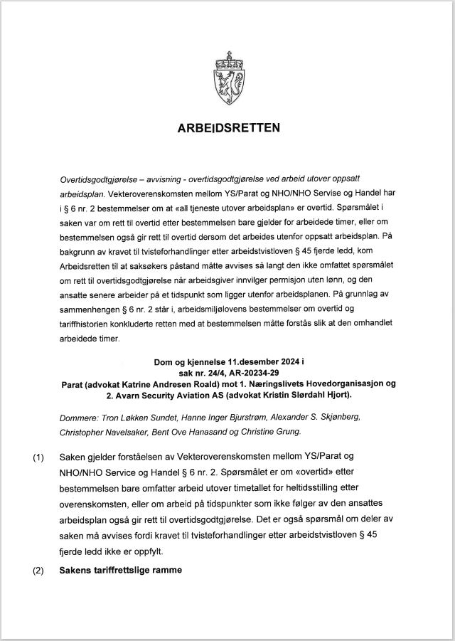 Tittel: | Tvist vedrørende forståelse av rett til overtidsgodtgjørelse - AR-2024-29 : 11. desember 2024 avsa Arbeidsretten dom | Ansvar: | Arbeidstakerorganisasjonen Parat (Advokat Katrine Andresen Roald) mot 1. Næringslivets Hovedorganisasjon (NHO), 2. Avarn Security Aviation AS (Advokat Kristin Slørdahl Hjort) | Materialtype: | Dom | Signatur: | Arbeidsretten | Utgitt: | Oslo : Arbeidsretten, 2024 | Omfang: | 17 sider | Emneord: | Arbeidsretten / Lønninger / Tvist | Stikkord: | AR-2024-29 / Arbeidstvistloven (2012) § 45 | Note: | Saksnummer 24/04 | Innhold: | Saken gjelder: Tvist vedrørende forståelse av rett til overtidsgodtgjørelse. Dommere: Sundet, Bjurstrøm, Skjønberg, Navelsaker, Hanasand, Glent, Grung Status: Avgjort Avgjørelsesdato: 11.12.24 |