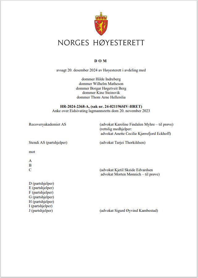 I tråd med flertallets syn blir Recoveryakademiets anke over lagmannsrettens rettsanvendelse forkastet.