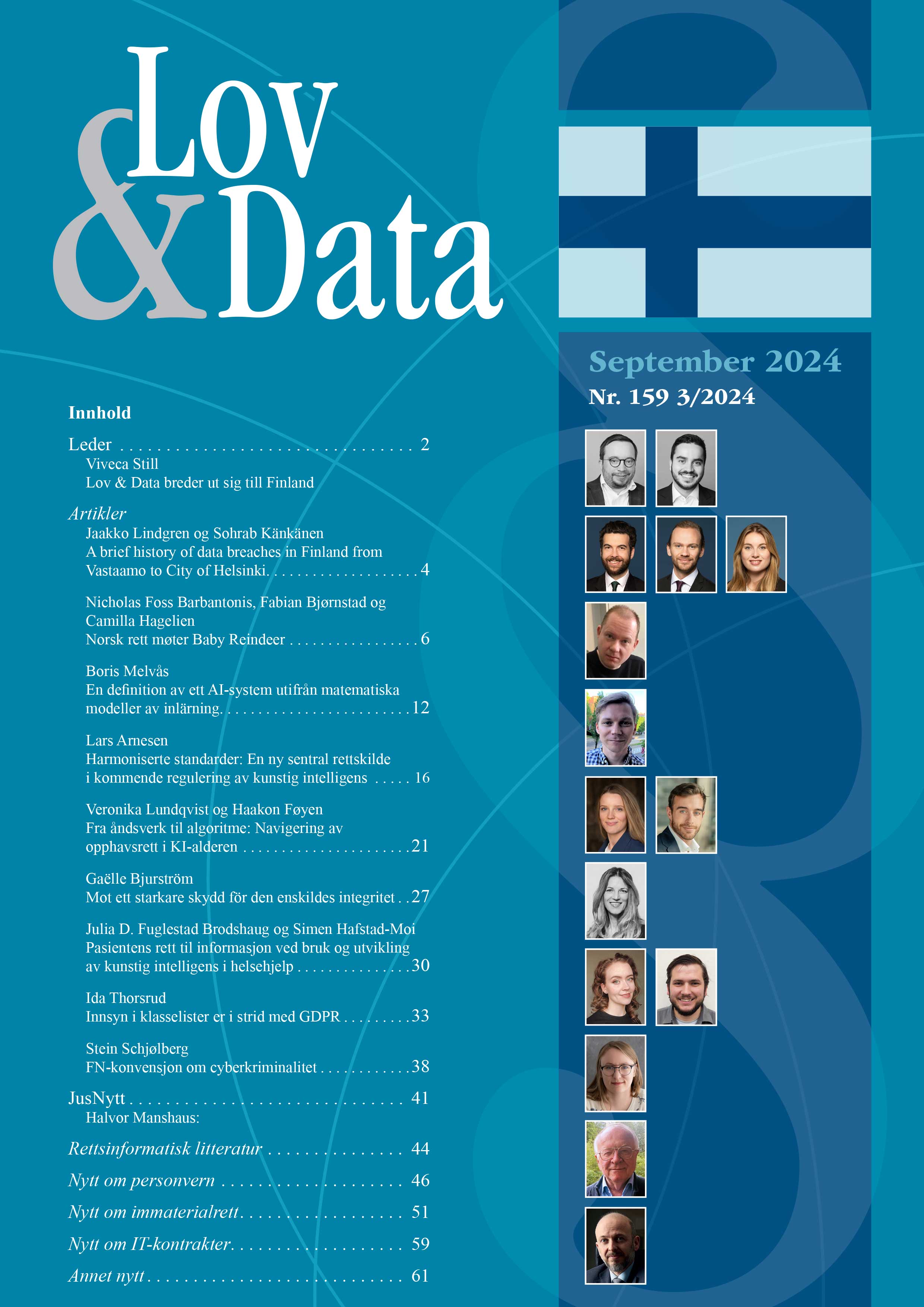 Tittel: | Lov&Data 3/2024 | Materialtype: | Tidsskrift | Signatur: | Lov&Data | Utgitt: | Oslo : Lovdata, 2024 | Omfang: | 61 sider | ISBN/ISSN: | 0800-7853 | Serie: | Lov&Data ; 3/2024  | Note: | Lov og data (LoD) er i: Lovdata Pro, abonnementsbasen fra 1984- og på Lovdatas åpne side fra 2023. Heftets artikler er indeksert i Jusbiblioteket / Rettsinfo.