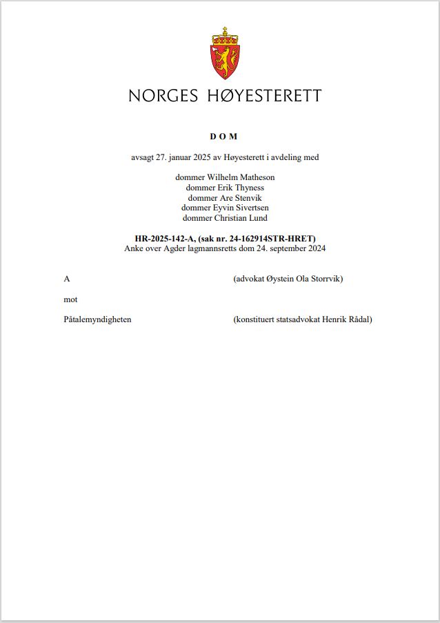Tittel: | Streng straff for seksuelle overgrep mot eget barn - HR-2025-142-A, (sak nr. 24-162914STR-HRET) : 27. januar 2025 avsa Høyesterett dom | Ansvar: | A (advokat Øystein Ola Storrvik) mot Påtalemyndigheten (konstituert statsadvokat Henrik Rådal) | Materialtype: | Dom | Signatur: | Høyesterett | Utgitt: | Oslo : Høyesterett, 2025 | Omfang: | 6 sider | Emneord: | Barn / Høyesterettsdom / Mindreårige / Strafferett / Straffeutmåling / Voldtekt | Stikkord: | HR-2025-142-A / Straffeloven (2005) § 299 / Straffeloven (2005) § 300 / Straffeloven (2005) § 301 / Straffeloven (2005) § 312 | Note: | Straffesak, anke over Agder lagmannsretts dom 24. september 2024. | Innhold: | En mann var i lagmannsretten dømt til fengsel i åtte år og tre måneder for seksuelle overgrep mot sin datter. Overgrepene startet da hun fylte åtte år, og pågikk frem til hun var omtrent elleve og et halvt. Ved to tilfeller hadde han hatt samleie med henne. Til sammen var det begått minst 175 overgrep.
