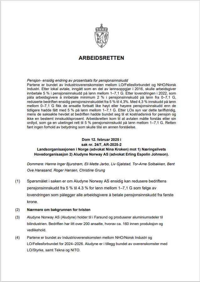 Tittel: | Tvist vedrørende tariffmessig plikt til innbetaling av pensjonsinnskudd - AR-2025-2 : 12. februar 2025 avsa Arbeidsretten dom | Ansvar: | Landsorganisasjonen i Norge (LO) med Fellesforbundet (Advokat Nina Kroken) mot 1. Næringslivets Hovedorganisasjon (NHO), 2. Aludyne Norway AS (Advokat Erling Espolin Johnson) | Materialtype: | Dom | Signatur: | Arbeidsretten | Utgitt: | Oslo : Arbeidsretten, 2025 | Omfang: | 12 sider | Emneord: | Arbeidsretten / Pensjonsordninger / Tariffavtaler / Tvist | Stikkord: | AR-2025-2 | Note: | Saksnummer 24/07 | Innhold: | Dommens innledning: Partene er bundet av Industrioverenskomsten mellom LO/Fellesforbundet og NHO/Norsk Industri. Etter lokal avtale, inngått som en del av lønnsoppgjør i 2016, skulle arbeidsgiver innbetale 5 % i pensjonsinnskudd på lønn mellom 1–7,1 G. Etter lovendringen i 2022, som påla arbeidsgivere å innbetale minimum 2 % i pensjonsinnskudd på lønn fra 0–7,1 G, reduserte bedriften ensidig pensjonsinnskuddet fra 5 % til 4,3%. Med 4,3 % innskudd på lønn mellom 0–7,1 G fikk de ansatte fortsatt like høyt eller høyere pensjonsinnskudd enn de tidligere hadde fått med 5 % på lønn mellom 1–7,1 G. Etter LOs syn var dette tariffstridig, mens de saksøkte hevdet at bedriften hadde bundet seg til et kostnadsnivå for pensjon og ikke en bestemt innskuddsprosent. Arbeidsretten kom til at avtalen måtte forstås etter sin ordlyd, som ga en ubetinget rett til 5 % pensjonsinnskudd på lønn mellom 1–7,1 G. Retten fant ingen forhold av betydning som skulle tilsi en annen forståelse.