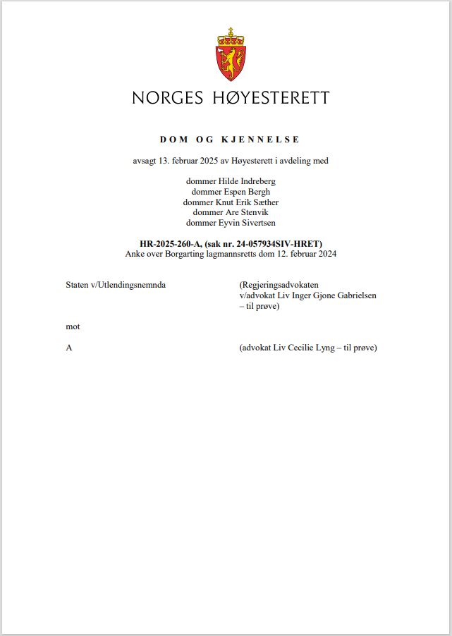 Rettsområde: Utlendingsrett, forvaltningsrett, menneskerettigheter Nøkkelavsnitt: 63–66, 72–74, 80 Dommere: Indreberg, Bergh, Sæther, Stenvik, Sivertsen