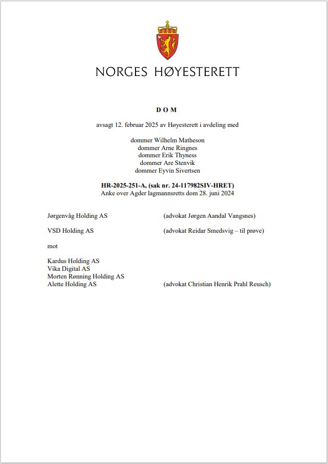 Tittel: | Kontrakt mellom gründere var urimelig og settes til side etter avtaleloven § 36 - HR-2025-251-A, (sak nr. 24-117982SIV-HRET) : 12. februar 2025 avsa Høyesterett dom | Ansvar: | Jørgenvåg Holding AS (advokat Jørgen Aandal Vangsnes), VSD Holding AS (advokat Reidar Smedsvig) mot Kardus Holding AS, Vika Digital AS, Morten Rønning Holding AS, Alette Holding AS (advokat Christian Henrik Prahl Reusch) | Materialtype: | Dom | Signatur: | Høyesterett | Utgitt: | Oslo : Høyesterett, 2025 | Omfang: | 16 sider | Emneord: | Avtalerett / Høyesterettsdom | Stikkord: | Avtaleloven (1918) § 36 / HR-2025-251-A | Note: | Sivil sak, anke over Agder lagmannsretts dom 28. juni 2024. | Innhold: | Seks gründere eide et selskap sammen. I 2017 solgte fire av gründerne til sammen 45,5 % av aksjene til de to gjenværende eierne for nærmere 41 millioner kroner. Kjøperne klarte ikke å finansiere kjøpesummen, og selgerne ga kreditt på kjøpesummen mot pant i aksjene. For at kjøperne skulle få tid til å realisere verdien av selskapet, ble det også innvilget flere betalingsutsettelser. Alle seks hadde et felles mål om få solgt selskapet videre, slik at de skulle få betalt for arbeidet som var nedlagt i virksomheten.