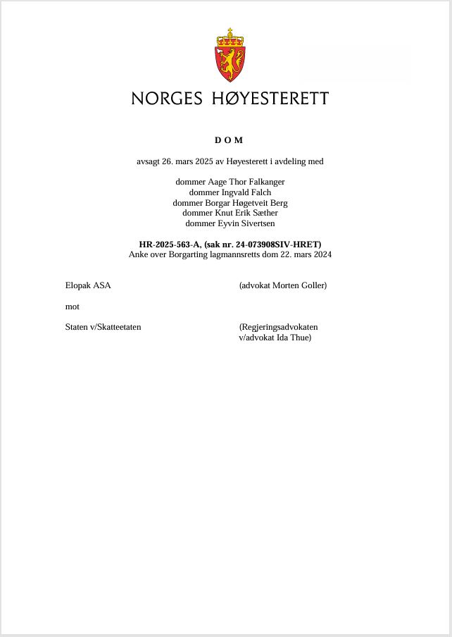 Tittel: | Utbytte fra sveitsisk datterselskap er skattepliktig - HR-2025-563-A, (sak nr. 24-073908SIV-HRET) : 26. mars 2025 avsa Høyesterett dom | Ansvar: | Elopak ASA (advokat Morten Goller) mot Staten v/Skatteetaten (Regjeringsadvokaten v/advokat Ida Thue) | Materialtype: | Dom | Signatur: | Høyesterett | Utgitt: | Oslo : Høyesterett, 2025 | Omfang: | 14 sider | Emneord: | Folkerett / Høyesterettsdom / Skatterett | Stikkord: | EFTA-konvensjonen / HR-2025-563-A / Skatteloven (1999) § 10-63 / Skatteloven (1999) § 2-39 | Geografiske emneord: | Sveits | Note: | Sivil sak, anke over Borgarting lagmannsretts dom 22. mars 2024. | Innhold: | Det norske morselskapet Elopak ASA mottok i hvert av årene 2010 og 2014 utbytte på ca. 200 millioner kroner fra sitt sveitsiske datterselskap. I årene til og med 2009 var datterselskapet skattlagt i Sveits etter særskilt gunstige regler (effektiv skattesats omkring 10 prosent), men fra 2010 valgte selskapet å la seg skattlegge etter de ordinære reglene i Sveits (effektiv skattesats omkring 20 prosent). Norske skattemyndigheter så bort fra selskapets valg og skattla utbyttene fordi de mente at Sveits var lavskatteland.