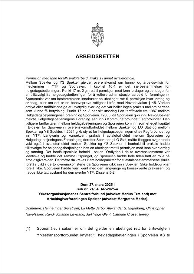 Tittel: | Tvist vedrørende tillitsvalgtes rett til permisjon - AR-2025-4 : 27. mars 2025 avsa Arbeidsretten dom | Ansvar: | Yrkesorganisasjonens Sentralforbund YS med Yrkestrafikkforbundet (Advokat Marius Træland) mot Arbeidsgiverforeningen Spekter med Sporveien AS (Advokat Margrethe Meder) | Materialtype: | Dom | Signatur: | Arbeidsretten | Utgitt: | Oslo : Arbeidsretten, 2025 | Omfang: | 16 sider | Emneord: | Arbeidsretten / Permisjon / Tillitsvalgte | Stikkord: | AR-2025-4 | Note: | Saksnummer 24/34 | Innhold: | Dommens innledning: Permisjon med lønn for tillitsvalgtarbeid. Praksis i annet avtaleforhold. Mellom Spekter og YS Spekter gjelder overenskomst om lønns- og arbeidsvilkår for medlemmer i YTF og Sporveien. I kapittel 10.4 er det særbestemmelser for helgedagsbetjeningen. Punkt 17 nr. 2 gir rett til permisjon med lønn lørdager og søndager for en tillitsvalgt fra helgedagsbetjeningen for å «utføre administrasjonsarbeid for foreningen.» Spørsmålet var om bestemmelsen innebærer en ubetinget rett til permisjon hver lørdag og søndag, eller om det er en behovsprøvd rettighet i tråd med Hovedavtalen § 45. Verken ordlyd eller tariffhistorie ga et utvetydig svar, og det var heller ingen praksis mellom partene som kunne få betydning. Punkt 17 nr. 2 har sitt utspring i en tariffavtale fra 1987 mellom helgedagsbetjeningens Forening og Sporveien. I 2000, da Sporveien gikk inn i Navo/Spekter meldte Helgedagsbetjeningens Forening seg inn i Kommuneforbundet/Fagforbundet. Den tidligere tariffavtalen mellom heldagsbetjeningen og Sporveien kom inn som et eget kapittel i B-delen for Sporveien i overenskomstforholdet mellom Spekter og LO Stat og mellom Spekter og YS Spekter. I 2024 gikk styret for helgedagsbetjeningen ut av Fagforbundet og inn YTF. Langvarig og konsekvent praksis i avtaleforholdet mellom Sporveien og Helgedagsbetjeningens Forening og deretter Spekter og LO Stat, måtte tillegges avgjørende vekt også i avtaleforholdet mellom Spekter og YS Spekter. I henhold til praksis hadde tillitsvalgte for helgedagsbetjeningen hatt en ubetinget rett til permisjon med lønn hver lørdag og søndag. Det forelå spesielle forhold i saken. Ordlyden i de to overenskomstene var identiske og hadde det samme utspringet, og Sporveien hadde hele tiden hatt en rolle på arbeidsgiversiden. Det måtte da kreves klare holdepunkter for at avtalebestemmelsene skulle forstås ulikt i de to overenskomstene da Sporveien gikk inn i Spekter. Slike holdepunkter forelå ikke. Sporveien hadde vært kjent med den langvarige og konsekvente praksisen, og hadde ikke tatt avstand fra den overfor YTF. Dissens 5-2.