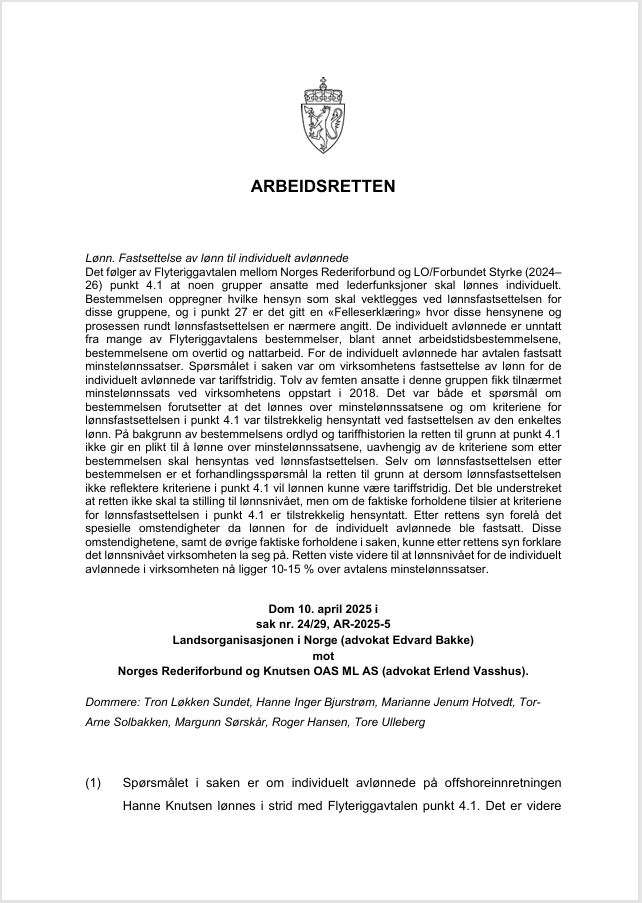 Sammendrag: Det følger av Flyteriggavtalen mellom Norges Rederiforbund og LO/Forbundet Styrke (2024–26) punkt 4.1 at noen grupper ansatte med lederfunksjoner skal lønnes individuelt. Bestemmelsen oppregner hvilke hensyn som skal vektlegges ved lønnsfastsettelsen for disse gruppene, og i punkt 27 er det gitt en «Felleserklæring» hvor disse hensynene og prosessen rundt lønnsfastsettelsen er nærmere angitt. De individuelt avlønnede er unntatt fra mange av Flyteriggavtalens bestemmelser, blant annet arbeidstidsbestemmelsene, bestemmelsene om overtid og nattarbeid. For de individuelt avlønnede har avtalen fastsatt minstelønnssatser. Spørsmålet i saken var om virksomhetens fastsettelse av lønn for de individuelt avlønnede var tariffstridig. Tolv av femten ansatte i denne gruppen fikk tilnærmet minstelønnssats ved virksomhetens oppstart i 2018. Det var både et spørsmål om bestemmelsen forutsetter at det lønnes over minstelønnssatsene og om kriteriene for lønnsfastsettelsen i punkt 4.1 var tilstrekkelig hensyntatt ved fastsettelsen av den enkeltes lønn. På bakgrunn av bestemmelsens ordlyd og tariffhistorien la retten til grunn at punkt 4.1 ikke gir en plikt til å lønne over minstelønnssatsene, uavhengig av de kriteriene som etter bestemmelsen skal hensyntas ved lønnsfastsettelsen. Selv om lønnsfastsettelsen etter bestemmelsen er et forhandlingsspørsmål la retten til grunn at dersom lønnsfastsettelsen ikke reflektere kriteriene i punkt 4.1 vil lønnen kunne være tariffstridig. Det ble understreket at retten ikke skal ta stilling til lønnsnivået, men om de faktiske forholdene tilsier at kriteriene for lønnsfastsettelsen i punkt 4.1 er tilstrekkelig hensyntatt. Etter rettens syn forelå det spesielle omstendigheter da lønnen for de individuelt avlønnede ble fastsatt. Disse omstendighetene, samt de øvrige faktiske forholdene i saken, kunne etter rettens syn forklare det lønnsnivået virksomheten la seg på. Retten viste videre til at lønnsnivået for de individuelt avlønnede i virksomheten nå ligger 10-15 % over avtalens minstelønnssatser. |