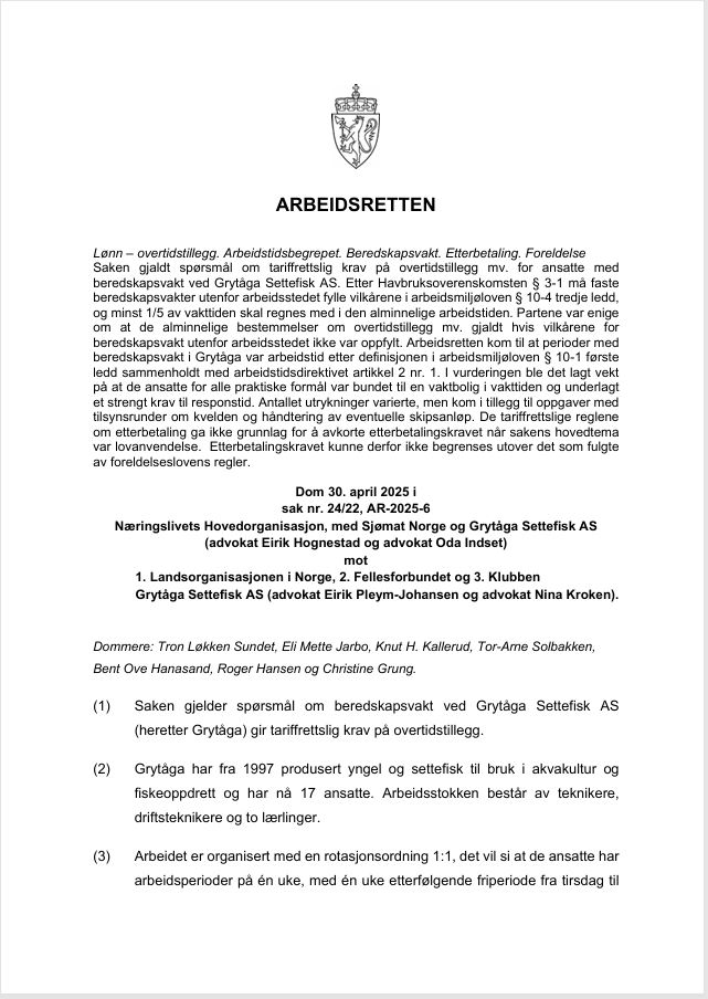 Ansvar: | 1. Næringslivets Hovedorganisasjon med Sjømat Norge AS, 2. Grytåga Settefisk AS (Advokat Eirik Hognestad Advokat Oda Indset) mot Landsorganisasjonen i Norge (LO) med Fellesforbundet og Klubben Grytåga Settefisk AS (Advokat Nina Kroken) |