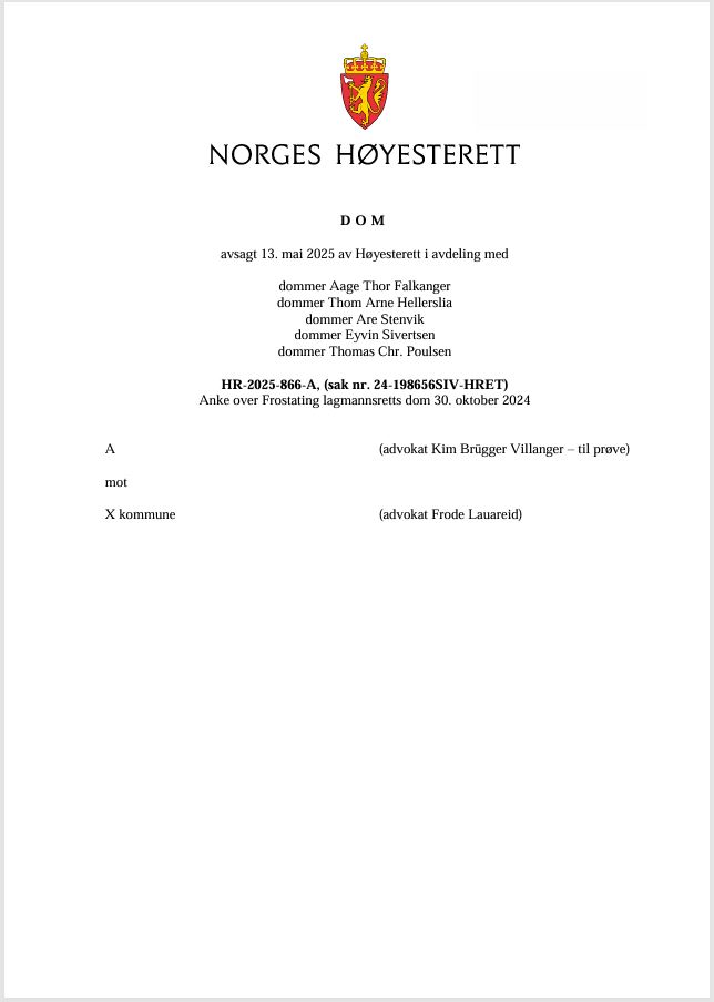 Tittel: | Far fratas foreldreansvaret etter drap på mor - HR-2025-866-A, (sak nr. 24-198656SIV-HRET) : 13. mai 2025 avsa Høyesterett dom | Ansvar: | A (advokat Kim Brügger Villanger) mot X kommune (advokat Frode Lauareid) | Materialtype: | Dom | Signatur: | Høyesterett | Utgitt: | Oslo : Høyesterett, 2025 | Omfang: | 12 sider | Emneord: | Barnevern / Drap / Foreldreansvar / Høyesterettsdom | Stikkord: | Barnevernsloven (2021) § 5-8 / HR-2025-866-A | Note: | Sivil sak, anke over Frostating lagmannsretts dom 30. oktober 2024. | Innhold: | Barnet saken gjelder, er i dag sju år gammelt. Da barnet var fire år, ble mor drept av far kort tid etter et samlivsbrudd. Far er dømt til fengsel i 21 år, som han i dag soner. Barnevernstjenesten har overtatt omsorgen for barnet, og barnet bor i dag i fosterhjem.