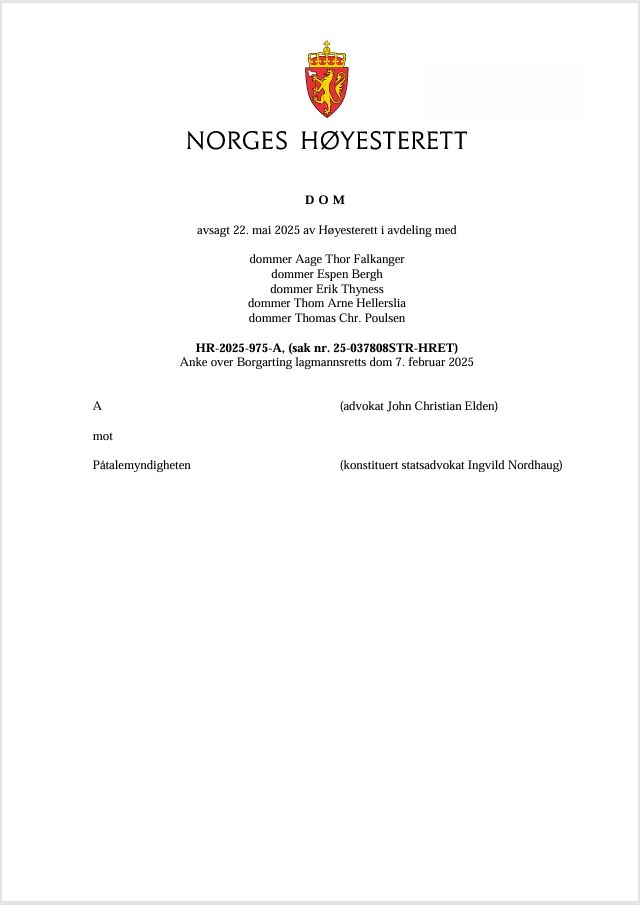 Tittel: | Straffansvar for lagring av seksuelt materiale var ikke foreldet - HR-2025-975-A, (sak nr. 25-037808STR-HRET) : 22. mai 2025 avsa Høyesterett dom | Ansvar: | A (advokat John Christian Elden) mot Påtalemyndigheten (konstituert statsadvokat Ingvild Nordhaug) | Materialtype: | Dom | Signatur: | Høyesterett | Utgitt: | Oslo : Høyesterett, 2025 | Omfang: | 7 sider | Emneord: | Barn / Foreldelse / Høyesterettsdom / Narkotika / Seksuelle forhold / Strafferett | Stikkord: | HR-2025-975-A / Straffeloven (2005) § 88 | Note: | Straffesak, anke over Borgarting lagmannsretts dom 7. februar 2025. | Innhold: | Tiltalte var i lagmannsretten dømt til betinget fengsel i fem måneder for lagring av materiale som seksualiserer barn og besittelse av mindre mengder marihuana.