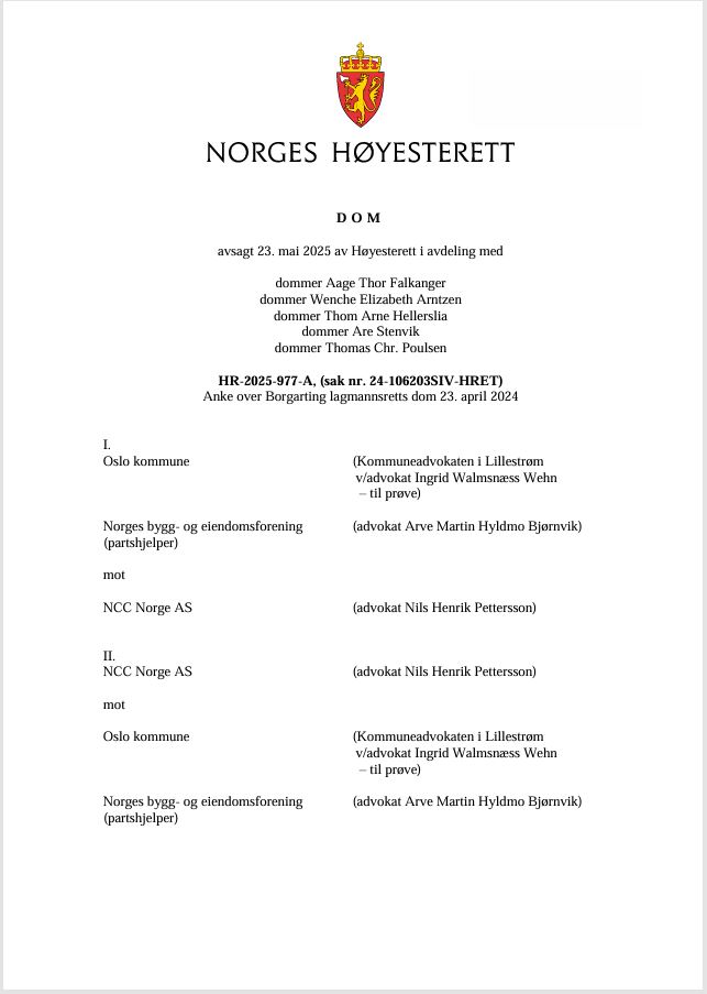 Tittel: | Deler av lagmannsrettsdom om sluttoppgjøret for Nye Jordal Amfi oppheves - HR-2025-977-A, (sak nr. 24-106203SIV-HRET) : 23. mai 2025 avsa Høyesterett dom | Ansvar: | I. Oslo kommune (Kommuneadvokaten i Lillestrøm v/advokat Ingrid Walmsnæss Wehn), Norges bygg- og eiendomsforening (advokat Arve Martin Hyldmo Bjørnvik) (partshjelper) mot NCC Norge AS (advokat Nils Henrik Pettersson). II. NCC Norge AS (advokat Nils Henrik Pett | Materialtype: | Dom | Signatur: | Høyesterett | Utgitt: | Oslo : Høyesterett, 2025 | Omfang: | 27 sider | Emneord: | Entrepriserett / Høyesterettsdom / Totalentreprise | Stikkord: | HR-2025-977-A / NS 8407 / NS 8407 - Punkt 27.4 / NS 8407 - Punkt 31.1 | Note: | Sivil sak, anke over Borgarting lagmannsretts dom 23. april 2024. Parter: I. Oslo kommune (Kommuneadvokaten i Lillestrøm v/advokat Ingrid Walmsnæss Wehn), Norges bygg- og eiendomsforening (advokat Arve Martin Hyldmo Bjørnvik) (partshjelper) mot NCC Norge AS (advokat Nils Henrik Pettersson). II. NCC Norge AS (advokat Nils Henrik Pettersson) mot Oslo kommune (Kommuneadvokaten i Lillestrøm v/advokat Ingrid Walmsnæss Wehn), Norges bygg- og eiendomsforening (advokat Arve Martin Hyldmo Bjørnvik) (partshjelper). | Innhold: | Oslo kommune kunngjorde i 2016 totalentreprise for riving av den gamle ishockeyhallen og bygging av Nye Jordal Amfi gjennom en offentlig anbudskonkurranse. NCC Norge AS ble tildelt oppdraget, og det ble inngått totalentreprisekontrakt basert på standardkontrakten NS 8407.
