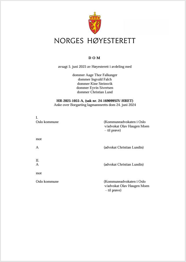 Tittel: | Oslo kommune er ikke erstatningsansvarlig etter stupeulykke - HR-2025-1055-A, (sak nr. 24-169099SIV-HRET) : 5. juni 2025 avsa Høyesterett dom | Ansvar: | Oslo kommune (Kommuneadvokaten i Oslo v/advokat Olav Haugen Moen) mot A (advokat Christian Lundin) II. A (advokat Christian Lundin)mot Oslo kommune (Kommuneadvokaten i Oslo v/advokat Olav Haugen Moen) | Materialtype: | Dom | Signatur: | Høyesterett | Utgitt: | Oslo : Høyesterett, 2025 | Omfang: | 9 sider | Emneord: | Erstatningsrett / Høyesterettsdom | Stikkord: | HR-2025-1055-A / Skadeserstatningsloven (1969) § 2-1 | Note: | Anke over Borgarting lagmannsretts dom. | Innhold: | En mann ble sterkt skadet etter å ha stupt fra Tomtekaia, som ligger ved utløpet av Akerselva i Bjørvika i Oslo. Kaia eies og er opparbeidet for allmennheten av Oslo kommune. Stupet skjedde fra ca. 2 meter høyde, og mannen traff en betongmatte over et fjernvarmerør som lå ca. 1,30 meter under vann. Vanndybden for øvrig var ca. 1,80 meter. På kaia var det varslet med skilt om grunt vann og advart mot stuping.