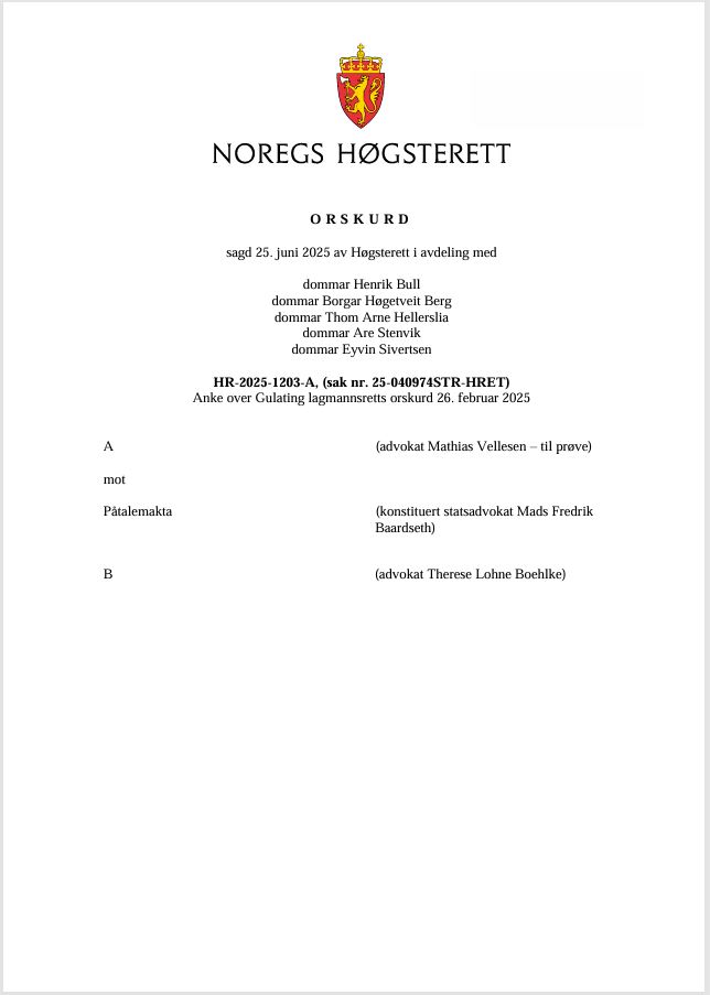 Tittel: | Pålegg om omvend valdsalarm var ikkje i strid med Grunnlova - HR-2025-1203-A, (sak nr. 25-040974STR-HRET) : 25. juni 2025 avsa Høyesterett dom | Ansvar: | A (advokat Mathias Vellesen) mot Påtalemakta (konstituert statsadvokat Mads Fredrik Baardseth), B (advokat Therese Lohne Boehlke) | Materialtype: | Dom | Signatur: | Høyesterett | Utgitt: | Oslo : Høyesterett, 2025 | Omfang: | 13 sider | Emneord: | Høyesterettsdom / Vold | Stikkord: | Grunnloven § 97 / HR-2024-1737-A / HR-2025-1203-A / Straffeprosessloven (1981) § 222g | Note: | Anke over Gulating lagmannsretts orskurd 26. februar 2025. | Innhold: | I april 2024 fekk påtalemakta lovheimel til å påleggje omvendt voldsalarm (elektronisk kontroll) når det i særlege tilfelle er påkravd for å hindre at nokon gjer ei straffbar handling mot ein annan person – straffeprosesslova § 222 g andre alternativ.