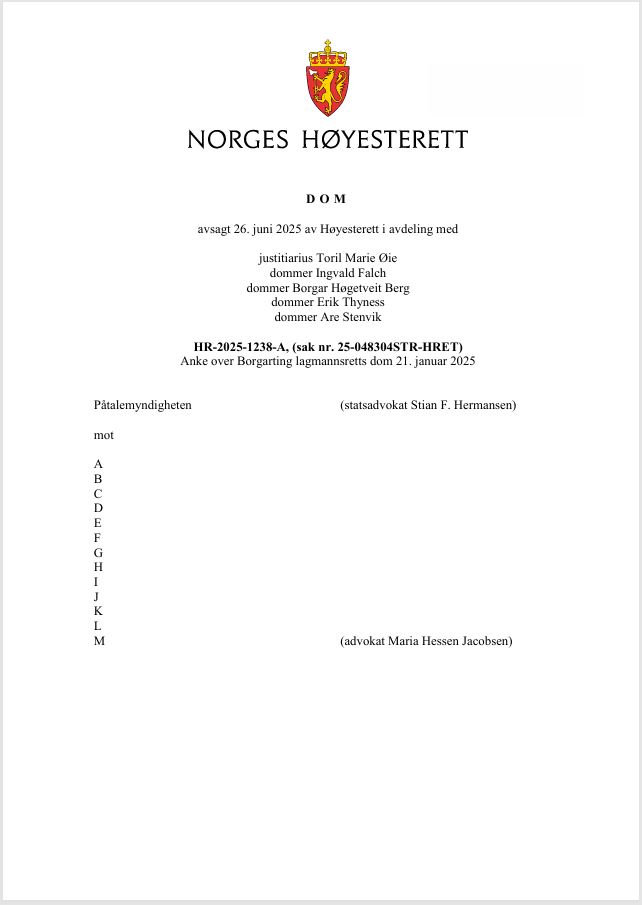 Tittel: | Fosen-aksjonistene kan ikke straffes - HR-2025-1238-A, (sak nr. 25-048304STR-HRET) : 26. juni 2025 avsa Høyesterett dom | Ansvar: | Påtalemyndigheten (statsadvokat Stian F.Hermansen) mot A,B,C,D,E,F,G,H,I,J,K,L,M (advokat Maria Hessen Jacobsen) | Materialtype: | Dom | Signatur: | Høyesterett | Utgitt: | Oslo : Høyesterett, 2025 | Omfang: | 8 sider | Emneord: | Høyesterettsdom / Straffeprosess / Strafferett / Vindkraft / Vindmøller | Stikkord: | EMK - Artikkel 11 - Konvensjon om beskyttelse av menneskerettighetene og de grunnleggende friheter / Grunnloven § 101 / HR-2025-1238-A / Politiloven (1995) § 30 / Politiloven (1995) § 5 | Note: | Straffesak, anke over Borgarting lagmannsretts dom. | Innhold: | Tretten aksjonister tilknyttet Norske Samers Riksforbunds Ungdomsutvalg og Natur og Ungdom hadde tatt seg inn i en departementsbygning i Akersgaten, hvor de satte seg ned i resepsjonsområdet. Bakgrunnen for aksjonen var at det hadde gått 500 dager siden Høyesteretts dom i Fosen-saken, hvor vindkraftutbygging på Fosenhalvøya ble ansett å være i strid med reindriftsamenes rettigheter. Aksjonistene demonstrerte mot det de oppfatter som et pågående menneskerettsbrudd.