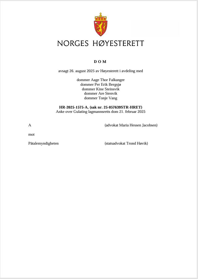 Tittel: | Mann som oppbevarte kamskjell i krabbeteiner frifinnes - HR-2025-1575-A, (sak nr. 25-057639STR-HRET) : 26. august 2025 avsa Høyesterett dom | Ansvar: | A (advokat Maria Hessen Jacobsen) mot Påtalemyndigheten (statsadvokat Trond Høvik) | Materialtype: | Dom | Signatur: | Høyesterett | Utgitt: | Oslo : Høyesterett, 2025 | Omfang: | 6 sider | Emneord: | Fiskerinæring / Havbruk / Høyesterettsdom / Strafferett | Stikkord: | HR-2025-1575-A / Høstingsforskriften (2021) § 29 | Note: | Straffesak, anke over Gulating lagmannsretts dom 21. februar 2025. | Innhold: | En mann var ilagt forelegg på 12 000 kroner for å ha oppbevart kamskjell i krabbeteiner. Teinene oppfylte ikke kravene til fluktåpning i høstingsforskriften § 29, gitt i medhold av havressursloven.