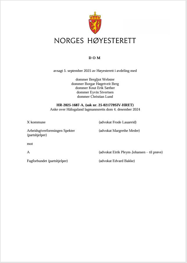 Tittel: | Ikke plikt til å vurdere omplassering ved avskjed - HR-2025-1687-A, (sak nr. 25-021779SIV-HRET) : 5. september 2025 avsa Høyesterett dom | Ansvar: | X kommune (advokat Frode Lauareid), Arbeidsgiverforeningen Spekter (partshjelper) (advokat Margrethe Meder) mot A (advokat Eirik Pleym-Johansen), Fagforbundet (partshjelper) (advokat Edvard Bakke) | Materialtype: | Dom | Signatur: | Høyesterett | Utgitt: | Oslo : Høyesterett, 2025 | Omfang: | 10 sider | Emneord: | Arbeidsrett / Avskjed / Høyesterettsdom | Stikkord: | Arbeidsmiljøloven - AML (2005) § 15-14 / HR-2025-1687-A | Note: | Sivil sak, anke over Hålogaland lagmannsretts dom 4. desember 2024. | Innhold: | En sykepleier ble gitt avskjed av en kommune i Finnmark etter å ha slått en psykisk utviklingshemmet bruker med flat hånd i ansiktet. Sykepleieren reiste sak for domstolene for å få kjent avskjeden ugyldig. I lagmannsretten fikk sykepleieren medhold. Retten viste blant annet til at kommunen ikke reelt sett hadde vurdert å omplassere sykepleieren.