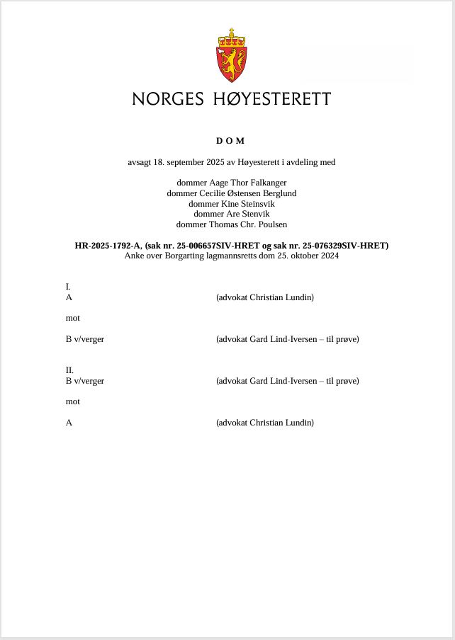 Tittel: | Utmåling av oppreisningserstatning etter drapsforsøk utført av 15-åring - HR-2025-1792-A, (sak nr. 25-006657SIV-HRET og sak nr. 25-076329SIV-HRET) : 18. september 2025 avsa Høyesterett dom | Ansvar: | A (advokat Christian Lundin) mot B v/verger (advokat Gard Lind-Iversen) II. B v/verger (advokat Gard Lind-Iversen) mot A (advokat Christian Lundin) | Materialtype: | Dom | Signatur: | Høyesterett | Utgitt: | Oslo : Høyesterett, 2025 | Omfang: | 10 sider | Emneord: | Drapsforsøk / Erstatningsrett / Høyesterettsdom / Oppreisning | Stikkord: | HR-2025-1792-A / Skadeserstatningsloven (1969) § 1-1 / Skadeserstatningsloven (1969) § 3-5 | Note: | Sivil sak, anke over Borgarting lagmannsretts dom 25. oktober 2024. | Innhold: | En gutt på 15 år og 4 måneder hadde stukket en 18-åring med kniv. I lagmannsretten ble han dømt for forsøk på drap og pålagt å betale oppreisning til skadelidte. Hendelsen inntraff en kveld da gutten var alene på vei hjem og støtte på fornærmede sammen med tre eldre venner. På grunn av tidligere uoverensstemmelser oppsto en konfrontasjon. Da holdt 18-åringen gutten fast og slo ham med et belte. Da gutten ikke klarte å rive seg løs, trakk han frem en kniv og stakk 18-åringen tre ganger i overkroppen. Stikkene medførte ikke alvorlig skade, men de kunne lett gjort det om vitale organer var blitt truffet.