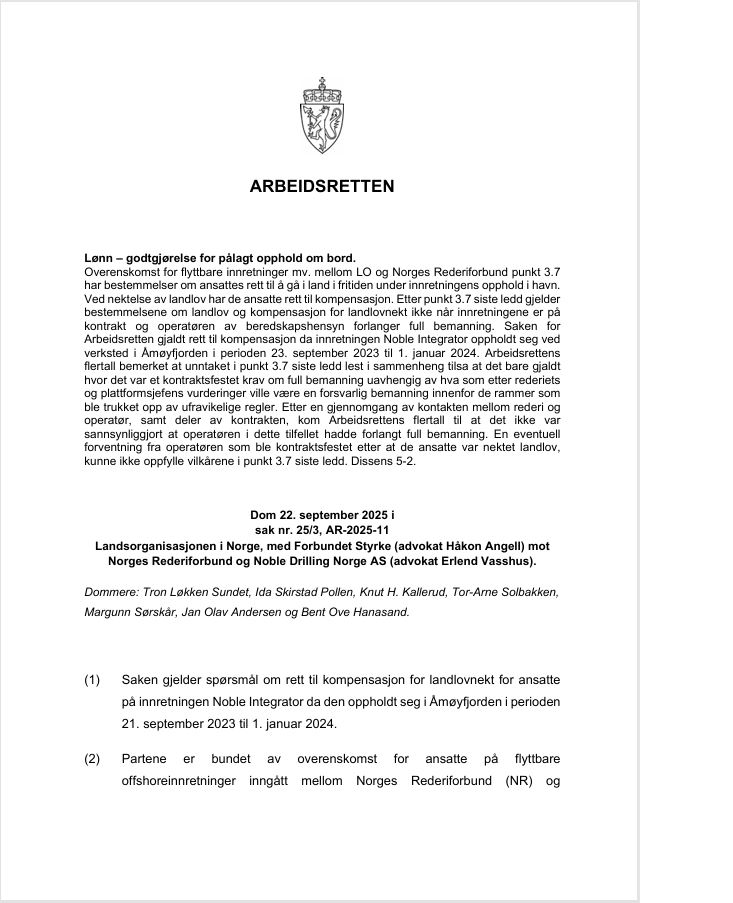 Saken gjelder: Tvist vedrørende godtgjøring ved pålegg om å bli ombord i sin fritid. Dommere: Sundet, Pollen, Kallerud, Solbakken, Sørskår, Andersen, Hanasand Status: Avgjort Avgjørelsesdato: 22.09.25 |