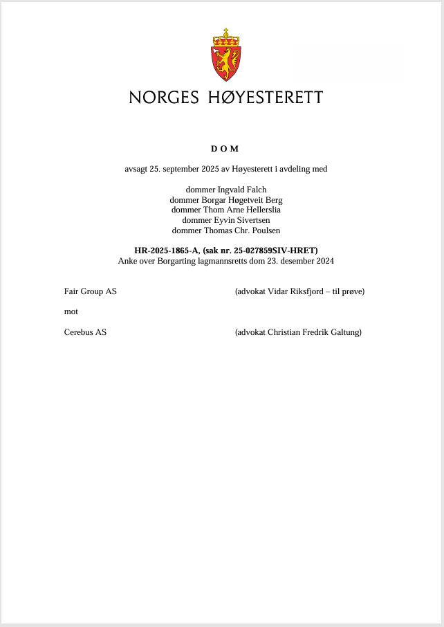 Tittel: | Aksjeeiere var inhabile til å delta i avstemning på selskapets generalforsamling - HR-2025-1865-A, (sak nr. 25-027859SIV-HRET) : 25. september 2025 avsa Høyesterett dom | Ansvar: | Fair Group AS (advokat Vidar Riksfjord) mot Cerebus AS (advokat Christian Fredrik Galtung) | Materialtype: | Dom | Signatur: | Høyesterett | Utgitt: | Oslo : Høyesterett, 2025 | Omfang: | 11 sider | Emneord: | Aksjeselskapsrett / Generalforsamling / Høyesterettsdom / Inhabilitet | Stikkord: | Aksjeloven (1997) § 5-3 / HR-2025-1865-A | Note: | Sivil sak, anke over Borgarting lagmannsretts dom 23. desember 2024. | Innhold: | Fair Group AS er et selskap med formål om å drive inkassovirksomhet. Selskapet har flere aksjeeiere, der de to største er Cerebus AS og Bilforum AS. I august 2023 solgte selskapet innmaten sin til et nystiftet selskap, som er heleid av Bilforum. Innmaten ble deretter videresolgt til et tredje selskap, som er eid av Bilforum og to andre aksjeeiere i Fair Group.