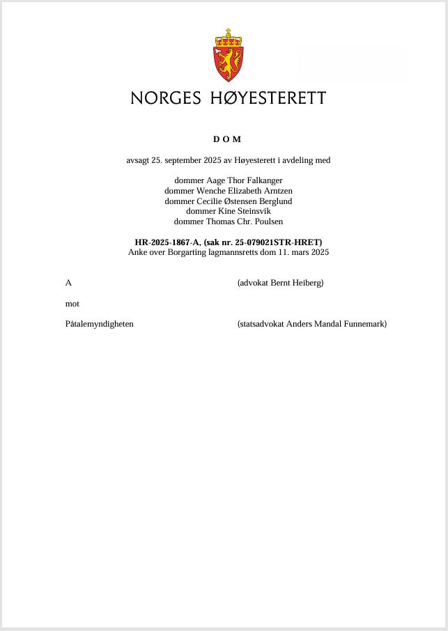 Tittel: | Forholdsmessighet ved forlengelse av forvaringsstraff - HR-2025-1867-A, (sak nr. 25-079021STR-HRET) : 25. september 2025 avsa Høyesterett dom | Ansvar: | A (advokat Bernt Heiberg) mot Påtalemyndigheten (statsadvokat Anders Mandal Funnemark) | Materialtype: | Dom | Signatur: | Høyesterett | Utgitt: | Oslo : Høyesterett, 2025 | Omfang: | 14 sider | Emneord: | Forvaring / Høyesterettsdom / Strafferett / Voldtekt | Stikkord: | EMK - Artikkel 5 - Konvensjon om beskyttelse av menneskerettighetene og de grunnleggende friheter / HR-2025-1867-A | Geografiske emneord: | Slovakia | Note: | Straffesak, anke over Borgarting lagmannsretts dom 11. mars 2025. | Innhold: | En slovakisk borger ble i 2014 dømt for voldtekt til forvaring med en tidsramme på 7 år og en minstetid på 4 år. Forvaringstiden er senere forlenget. Som følge av dommen ble mannen også utvist fra Norge.