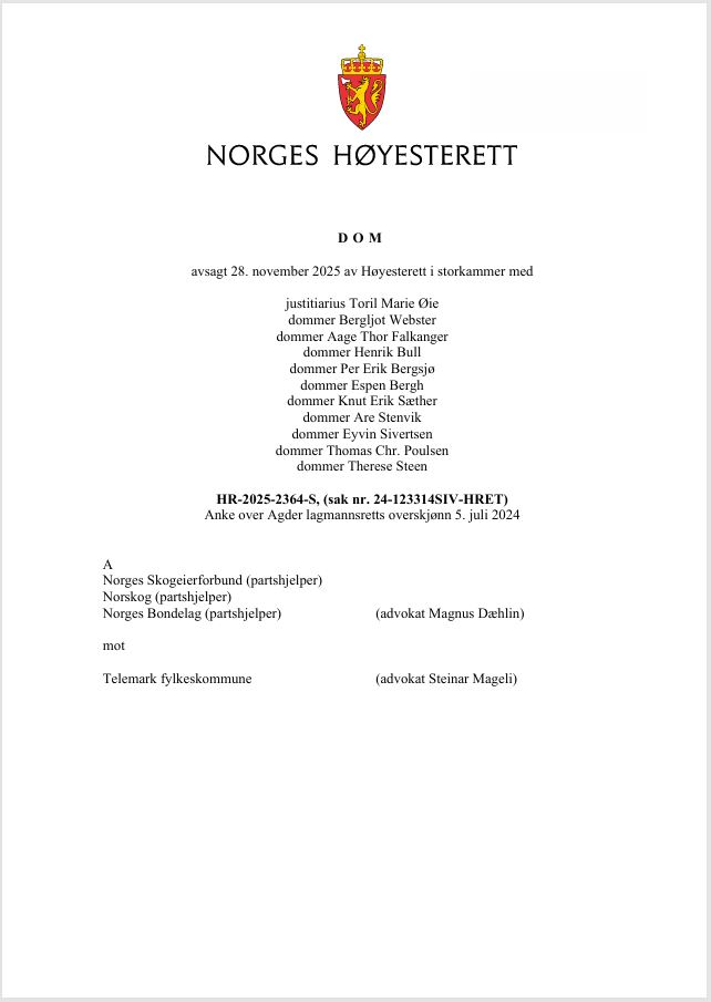 | Tittel: | Kapitaliseringsrenten ved ekspropriasjon skal fortsatt være 4 prosent (Nome kommune) - HR-2025-2364-S, (sak nr. 24-123314SIV-HRET) : 28. november 2025 avsa Høyesterett dom | | Ansvar: | A, Norges Skogeierforbund (partshjelper), Norskog (partshjelper), Norges Bondelag (partshjelper) (advokat Magnus Dæhlin) mot Telemark fylkeskommune (advokat Steinar Mageli) | | Materialtype: | Dom | | Signatur: | Høyesterett | | Utgitt: | Oslo : Høyesterett, 2025 | | Omfang: | 21 sider | | Emneord: | Ekspropriasjonsrett / Høyesterettsdom / Renter | | Stikkord: | Ekspropriasjonserstatningslova (1984) § 10 / Ekspropriasjonserstatningslova (1984) § 3 / Ekspropriasjonserstatningslova (1984) § 6 / Grunnloven § 105 / HR-2025-2364-S / Skjønnsprosessloven (1917) § 38 | | Geografiske emneord: | Nome | | Note: | Sivil sak, anke over Agder lagmannsretts overskjønn 5. juli 2024. | | Innhold: | Saken gjelder såkalt kapitaliseringsrente ved ekspropriasjon av en skogeiendom. Når erstatningen for tapt bruksverdi utbetales som et engangsbeløp, må fremtidige inntekter regnes om til dagens verdi. Denne beregningen bygger på en kapitaliseringsrente – en rentesats som fastsettes ut fra en forventning om at erstatningen investeres på en fornuftig måte. Jo høyere rentesatsen er, desto lavere blir erstatningen. Lagmannsretten la til grunn at rettspraksis tilsier en standardisert kapitaliseringsrente på 4 prosent. Spørsmålet for Høyesterett var om dette bygger på riktig rettsanvendelse.